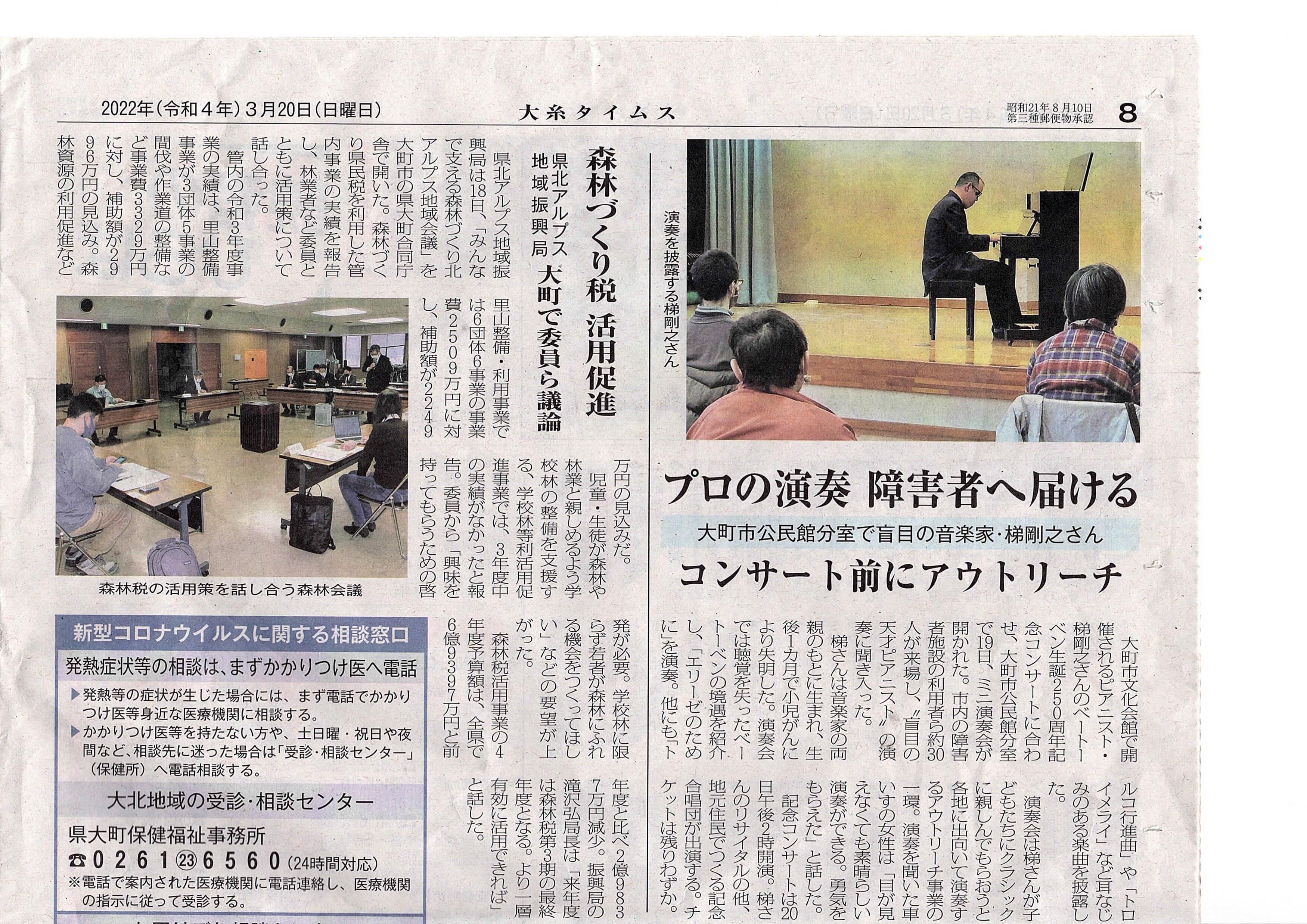 2022年3月19日長野県大町市公民館分室で、市内の障碍者施設の利用者ら約30人が集まりコンサートが行われました。曲間では梯さんの実体験によるエピソードを交えながらわかりやく曲目を解説し、約40分間にわたり聴衆は演奏とトークに耳を傾けていた。